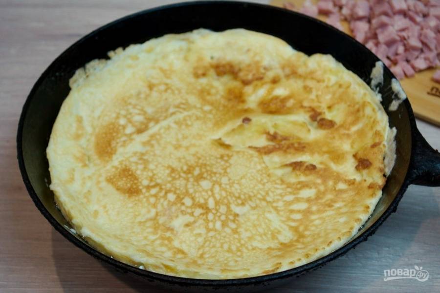 Разогрейте сковороду. Влейте на неё немного растительного масла. Вылейте омлетную массу в сковороду и обжарьте омлет.