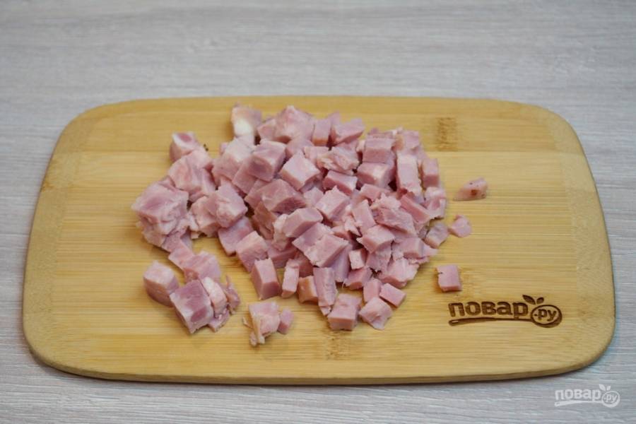 Для приготовления блюда я предлагаю взять ветчину. Есть варианты, когда блюдо готовится с обжаренной свининой, но вкуснее и эффектнее блюдо будет с использованием ветчины. Ветчину нарежьте кубиками.