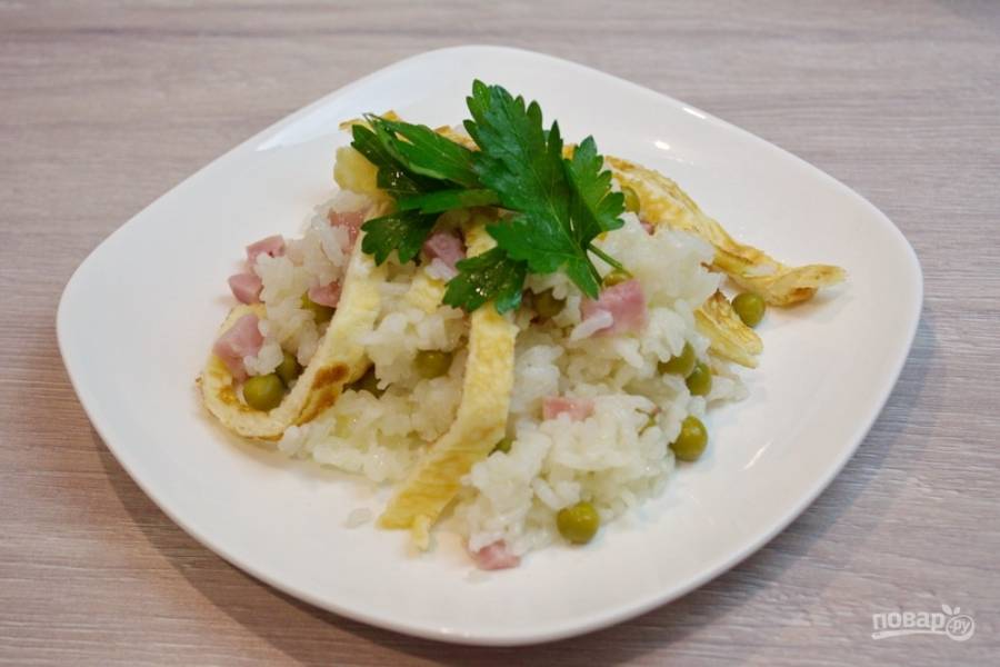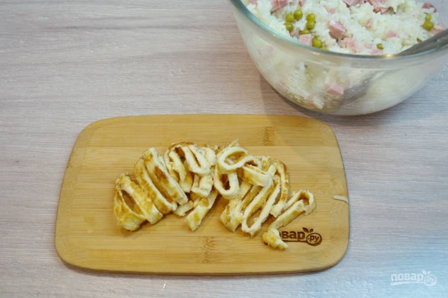 Омлет нужно нарезать на полоски и добавить к рису. Перемешайте.