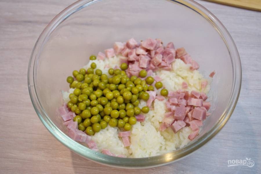 Добавьте нарезанную ветчину и консервированный горошек.