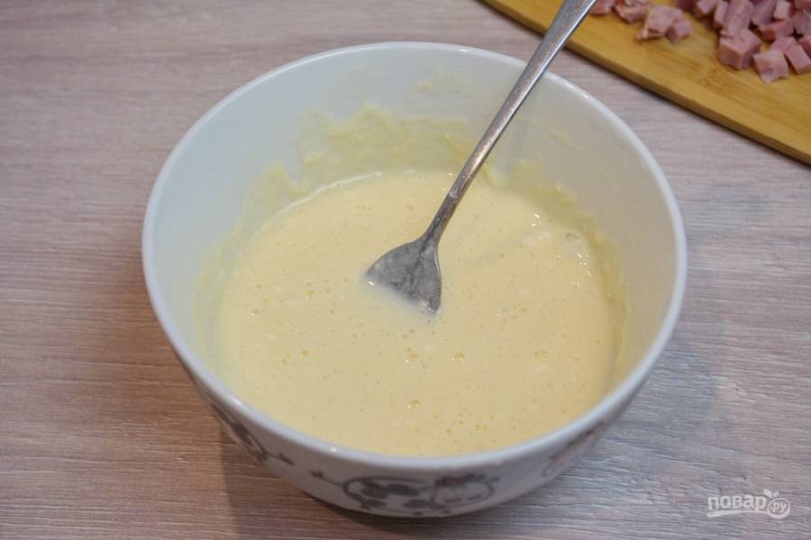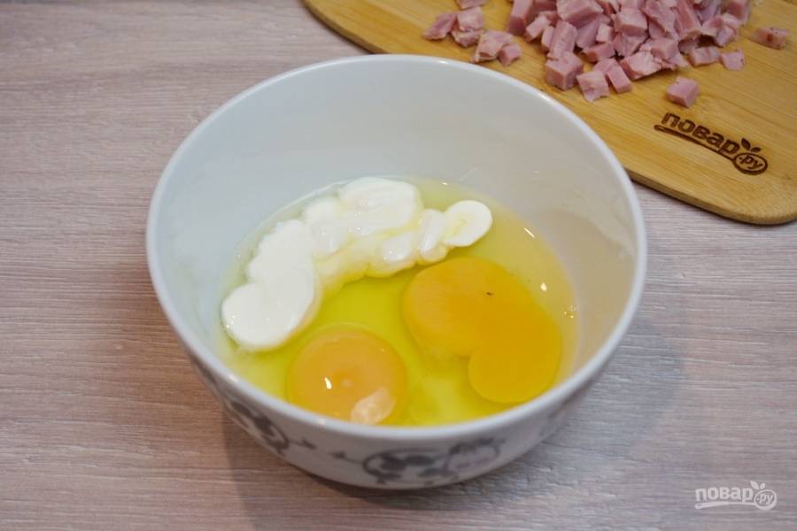 В миску вбейте 2 яйца, добавьте 2 ложки сметаны и 3 ст. ложки воды. Взбейте массу до однородности.