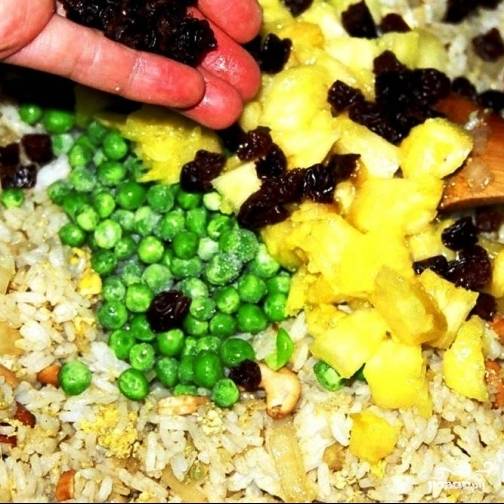 Ананас разрезаем вдоль пополам, из обеих половинок аккуратно вырезаем мякоть. Мякоть нарезаем небольшими кубиками, а оставшуюся лодочку из ананаса не выбрасываем - в ней будем эффектно подавать блюдо. Добавляем в сковороду мякоть ананаса, замороженный горошек (по желанию) и изюм (по желанию).