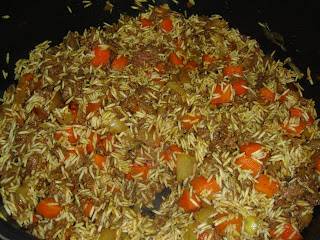 Рецепт приготовления азиатского блюда из риса с сушеной клюквой, морковью, луком, имбирем, грибами, сельдереем и апельсиновым соком.