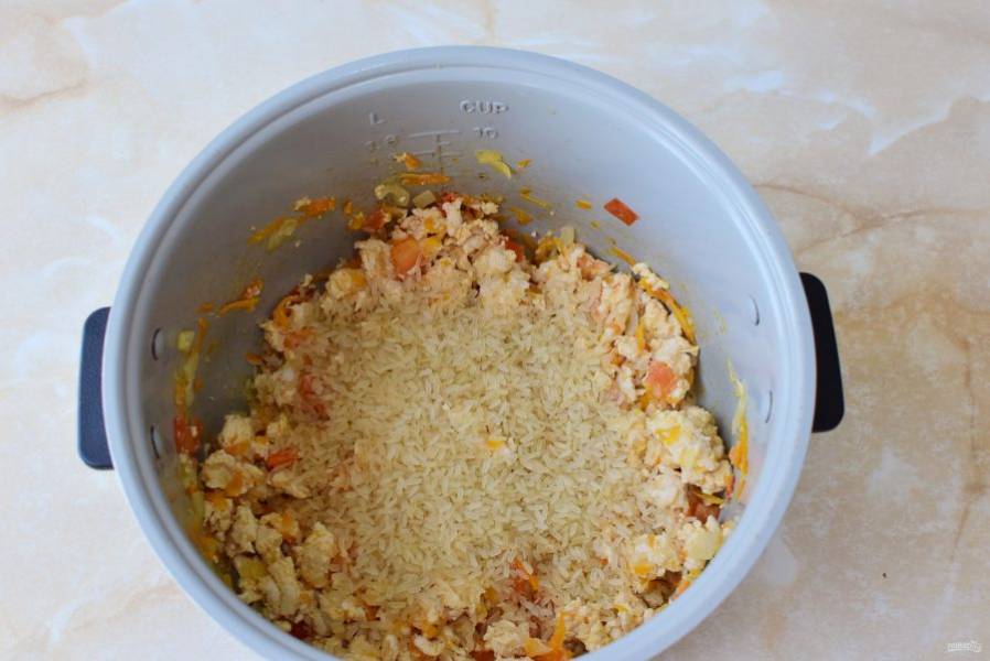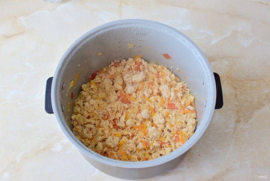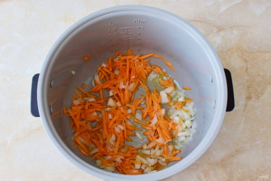Включите мультиварку на режим "Жарка". В горячую чашу налейте немного растительного масла. Выложите лук и морковь. Обжарьте овощи 2-3 минуты.