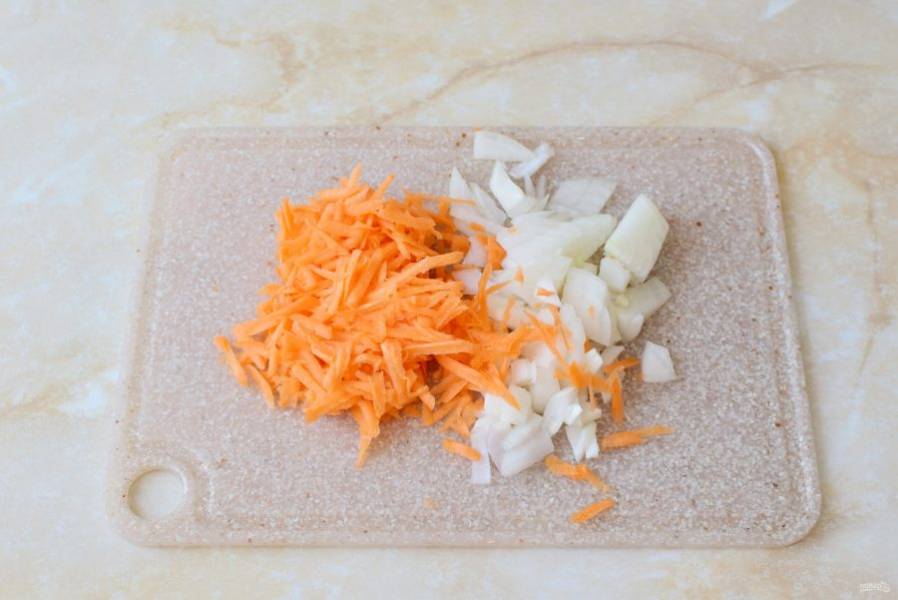 Лук и морковь очистите, ополосните и измельчите. Потрите морковь на терке, а лук мелко нарежьте.