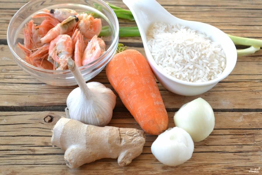 Подготовьте все необходимые ингредиенты. Креветки заранее отварите до готовности и очистите. Лук, чеснок и морковь очистите. Имбирь можно взять сушеный молотый, но лучше все же использовать свежий. Отрежьте от него небольшой кусочек, мелко его порежьте.