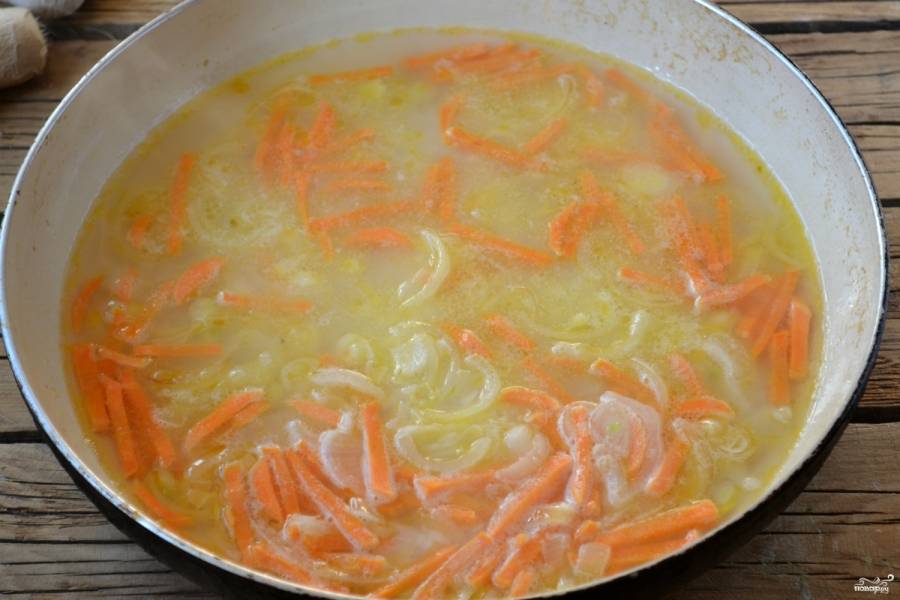 Обжарьте лук и морковь до мягкости, добавьте чеснок и имбирь. Затем влейте бульон, доведите до кипения — и можно всыпать промытый рис.