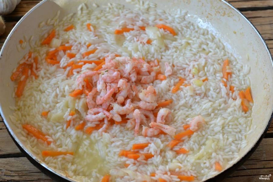Когда рис будет почти готов, добавьте очищенные креветки, перемешайте и тушите до готовности. Не забудьте добавить соль.