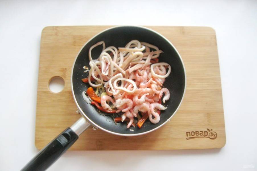 Выложите креветки в сковороду. Кальмары очистите от пленки, помойте и варите 3 минуты. После охладите и нарежьте. Добавьте в сковороду. Посолите и поперчите по вкусу. Тушите все эти ингредиенты 5 минут.