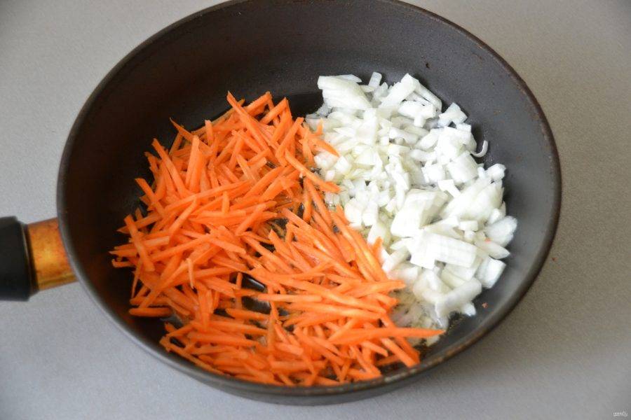 Мелко порежьте лук, натрите на терке морковь, обжарьте на растительном масле.