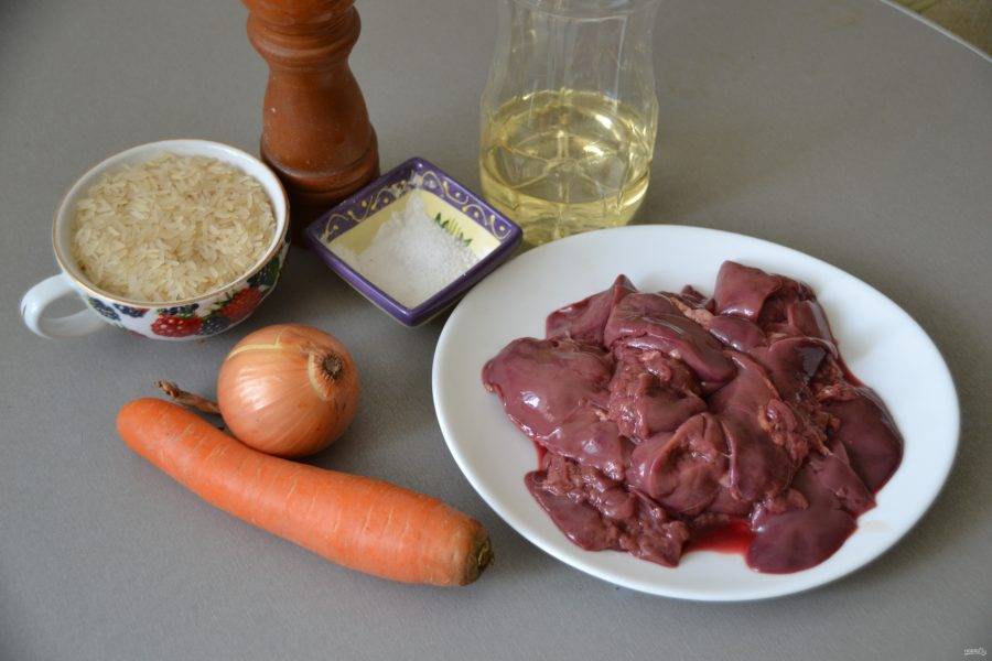 Пока обжариваются морковь и лук, поставьте воду для отваривания риса, очистите куриную печень от всего ненужного, нарежьте на небольшие кусочки.