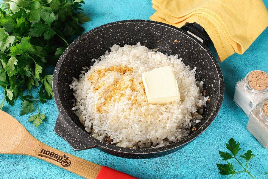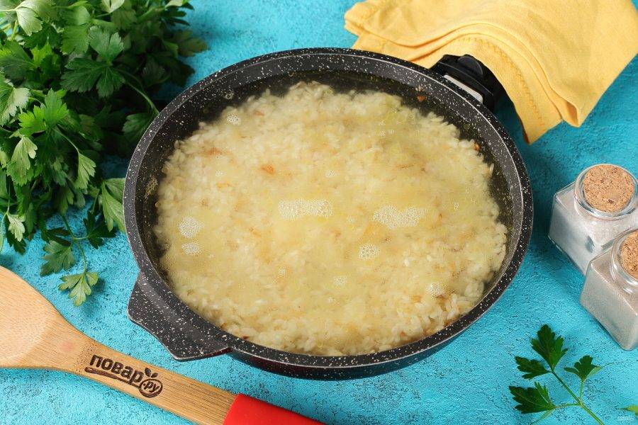 Помешивая, на небольшом огне, дайте каждой рисинке покрыться маслом.