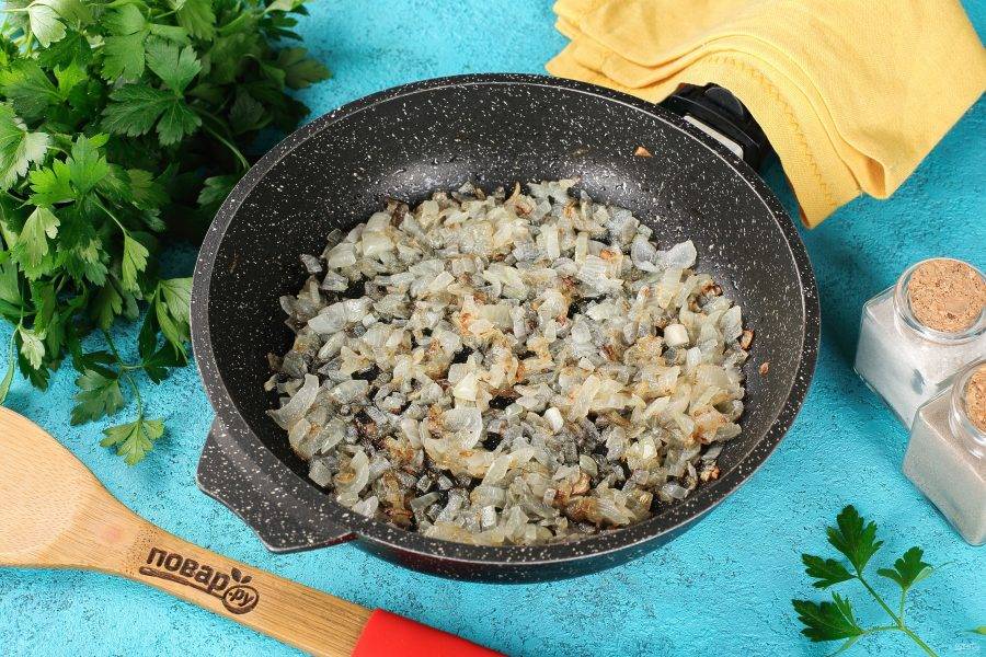 Разогрейте сковороду с растительным маслом. Выложите нарезанный кубиками лук и обжарьте периодически помешивая до золотистого цвета.