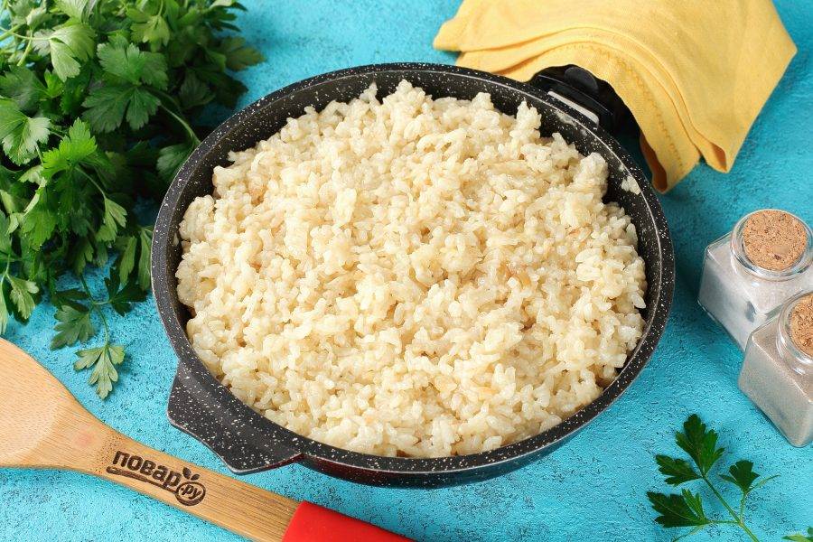 Залейте рис горячей водой, она должна покрывать его не более, чем на 1,5-2 пальца. Если необходимо, воду досолите.