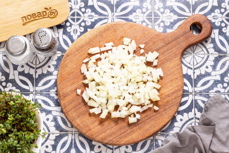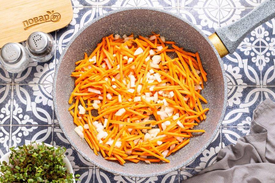 Разогрейте сковороду на среднем огне. Выложите морковь и репчатый лук, жарьте овощи 3-4 минуты до мягкости и золотистого цвета.