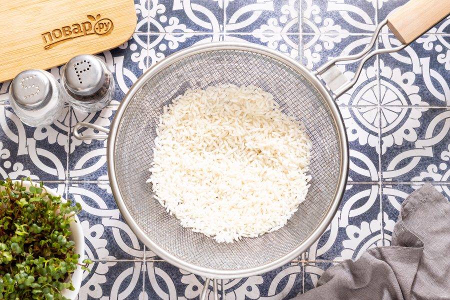 Рис промойте несколько раз до прозрачности. Откиньте на сито, дайте стечь лишней жидкости.
