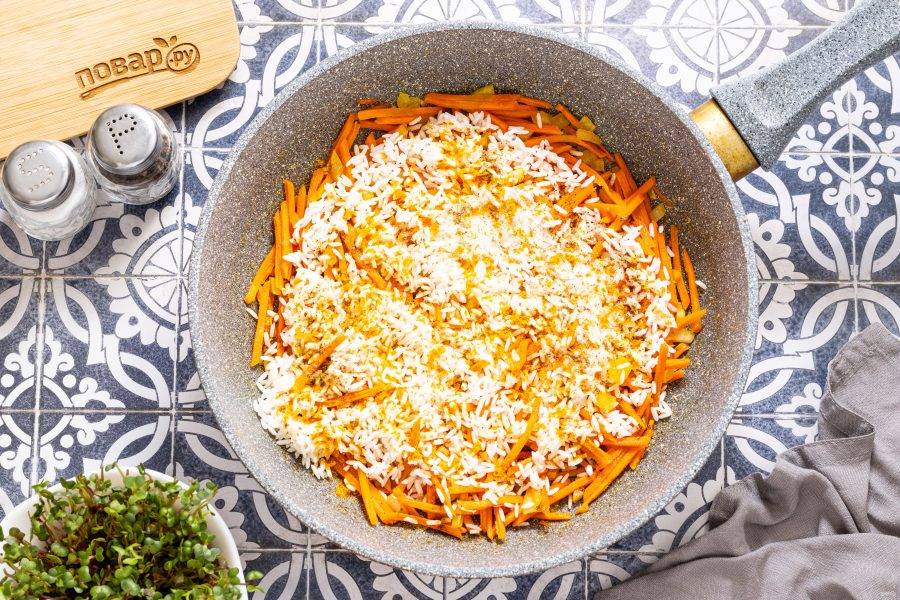 Доведите до кипения, убавьте огонь до минимального и варите около 20-25 минут, пока вся жидкость не впитается в рис. После снимите с плиты и дайте постоять рису еще 5 минут.