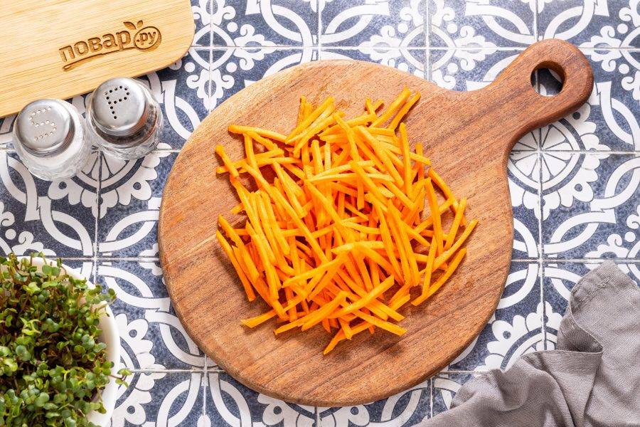 Морковь очистите от кожуры, натрите на терке. Я использую терку для моркови по-корейски.