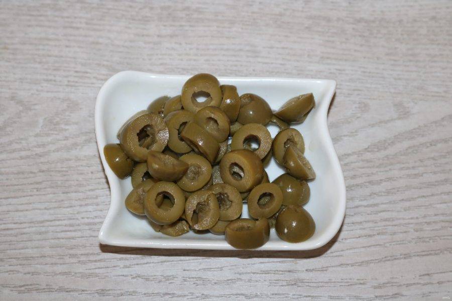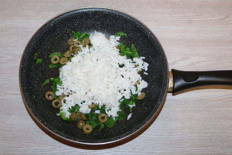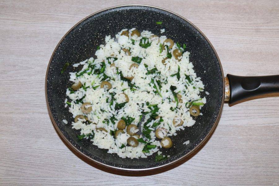 Добавьте нарезанные оливки. Перемешайте, обжаривайте 1 минуту.