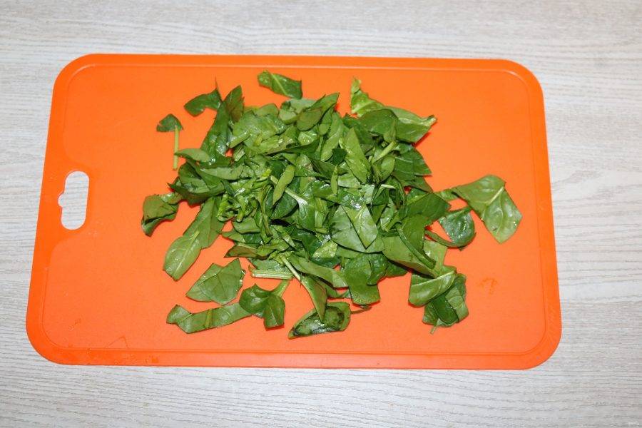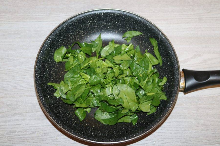 Потушите шпинат в небольшом количестве масла 1-2 минуты, чтобы он стал меньшим в объёме и дал сок в масло.