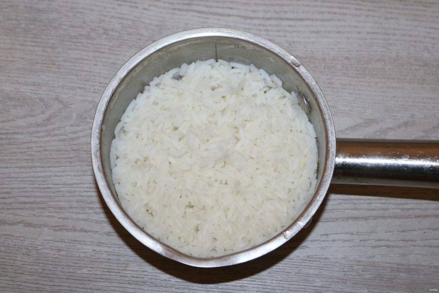 Рис промойте, залейте водой, доведите до кипения, посолите по вкусу. Варите на медленном огне до готовности.