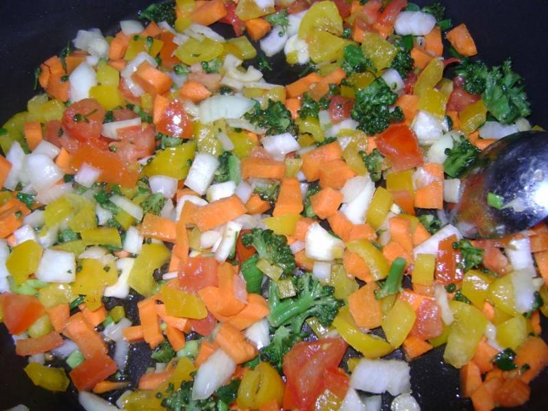 Кальмар нарезать кольцами. На сковороде с оливковым маслом в течении пяти минут потушить овощи (морковь, лук репчатый и зеленый, перец, чеснок, брокколи, помидор)