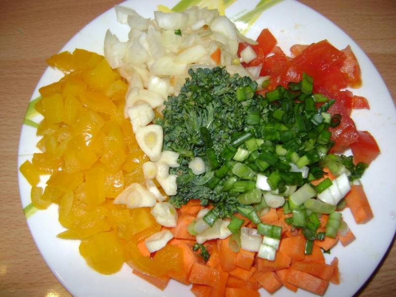 Рис варить до готовности 30 минут. Пока варится рис креветки очистим и зальем подсоленной водой на несколько минут. Помидор, морковь, лук, перец нарезать кубиками, брокколи и зеленый лук произвольно. Чеснок нарезать кружками.