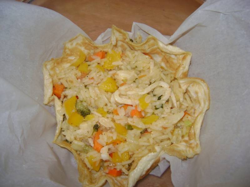 Яйца подсолить и взбить миксером. Испечь два омлета. Для подачи риса можно использовать и блины. В глубокую миску положить бумагу для запекания, омлет, а на омлет рис с овощами