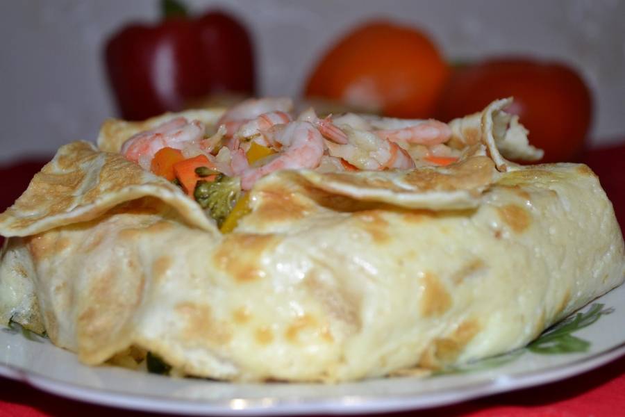 Перевернуть миску с содержимым на тарелку. Надрезать сверху крестообразно, отогнуть кончики омлета или блина. Сверху на рис положить креветки.