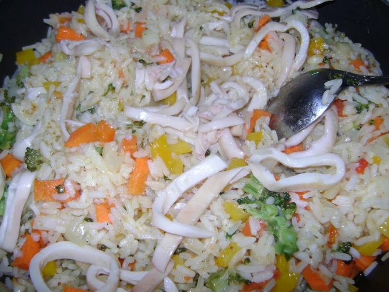 Добавить к овощам сваренный рис, карри, черный перец, прогреть еще две минуты. Добавить кальмары еще минуты на три.