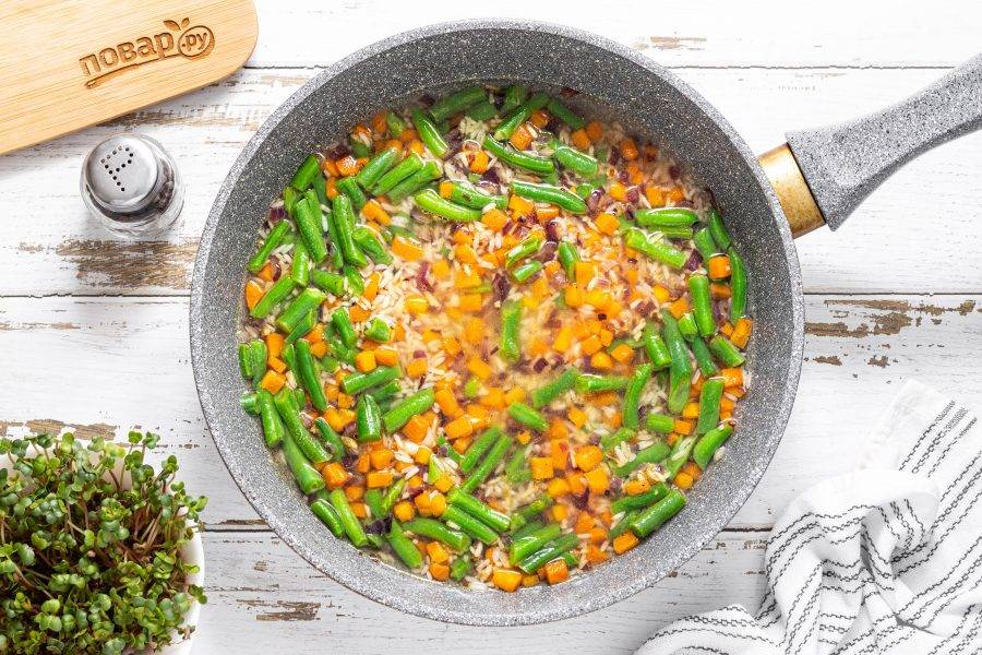 После добавьте стручковую фасоль, поперчите по вкусу. Прогрейте 1-2 минуты все вместе.