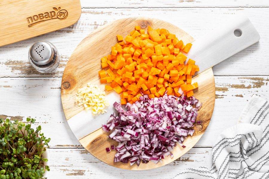 Репчатый лук и морковь нарежьте на маленькие кубики. Чеснок мелко порубите.