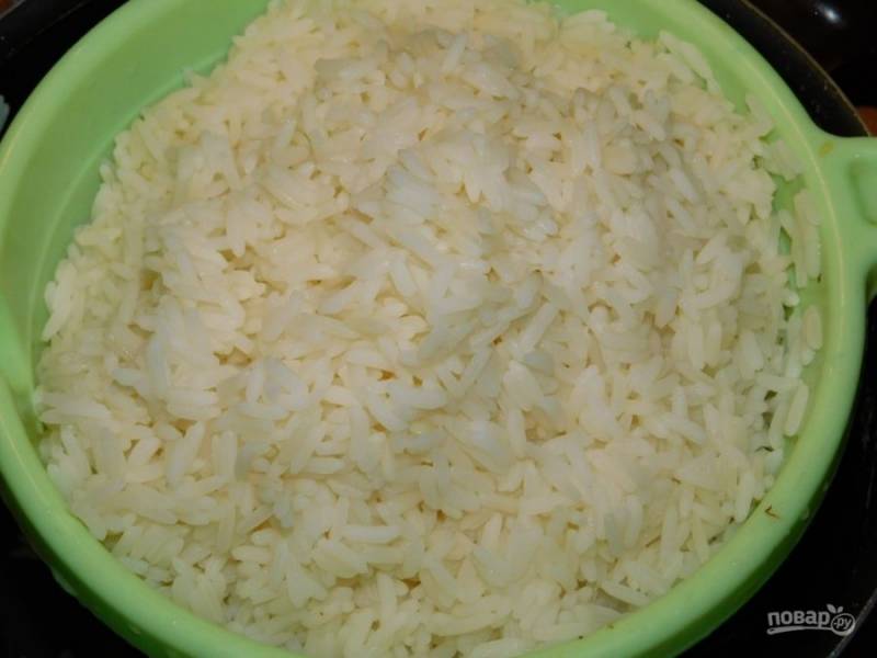 Затем содержимое сковороды смешайте с рисом. Прогрейте хорошо, добавьте соль и специи по вкусу.