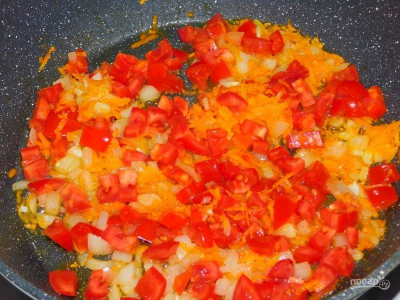Добавьте нарезанные помидоры. Потушите в течение 3-5 минут.