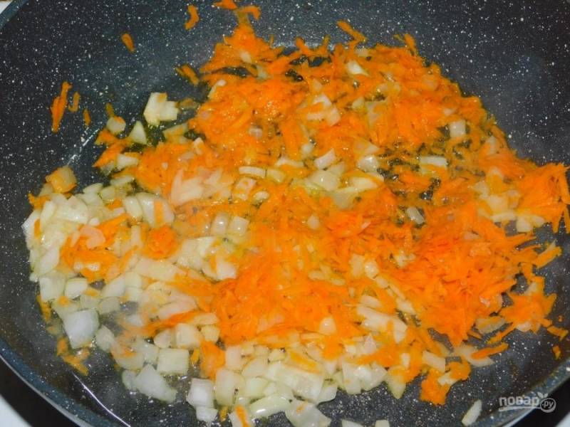 Затем нарежьте мелко лук, натрите морковь на терке и обжарьте все вместе.