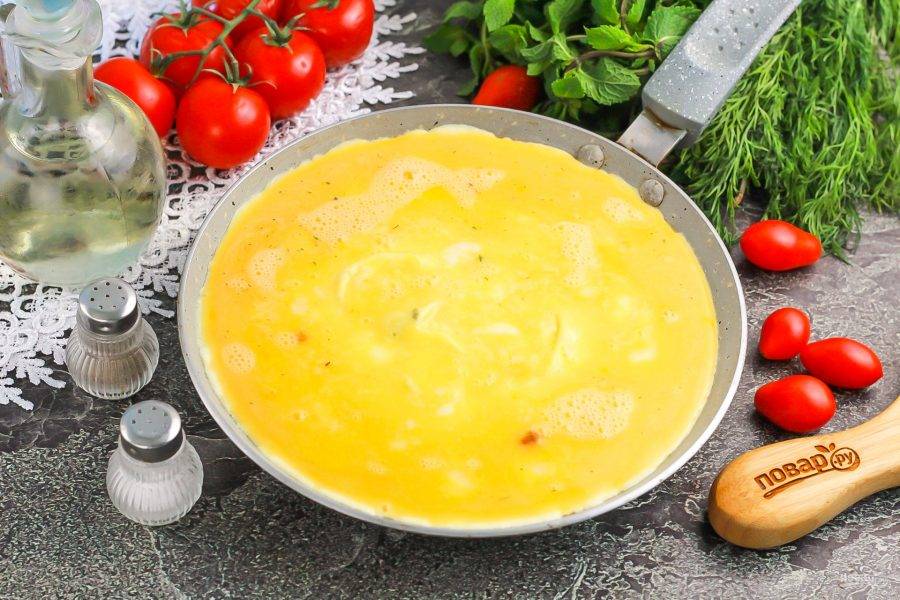 Прогрейте сковороду с оставшимся растительным маслом и аккуратно влейте на нее взбитую яичную массу. Убавьте нагрев до умеренного и обжарьте омлет около 4-5 минут до легкого схватывания. Чтобы он уплотнился, но не стал слишком плотным, иначе не сможете его свернуть.
