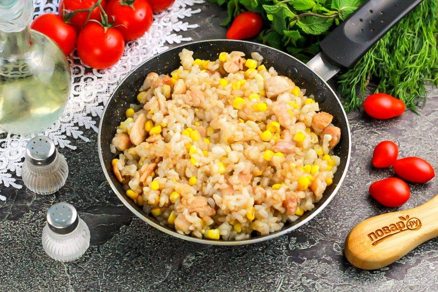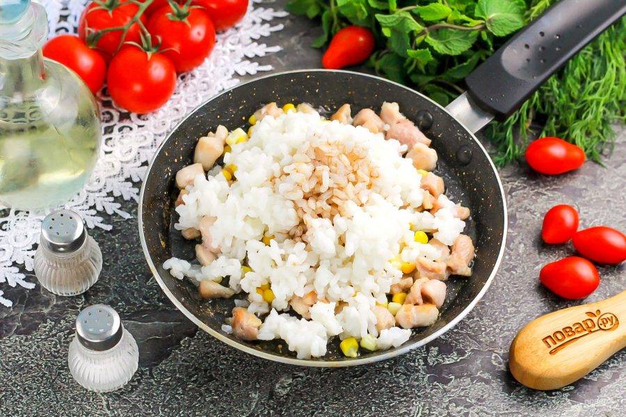 Добавьте к рису консервированную кукурузу и обжарьте еще 1 минуту.