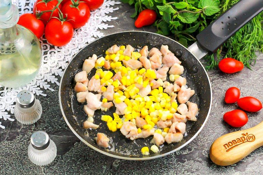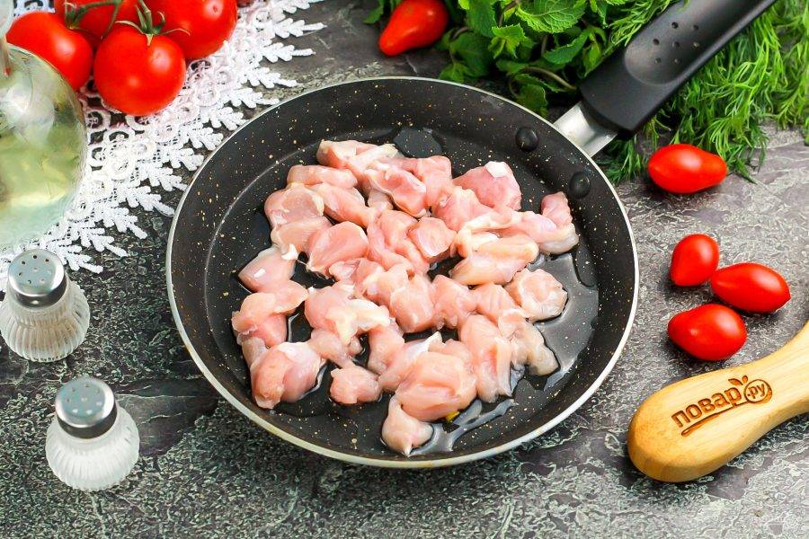 Промойте куриное филе, обсушите салфетками и нарежьте мелкими кубиками, кусочками. Прогрейте половину растительного масла на сковороде и выложите нарезку филе. Обжарьте около 3-5 минут до румяности.