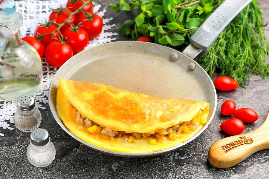Выложите на одну половину жареный рис и прикройте второй половинкой омлета.