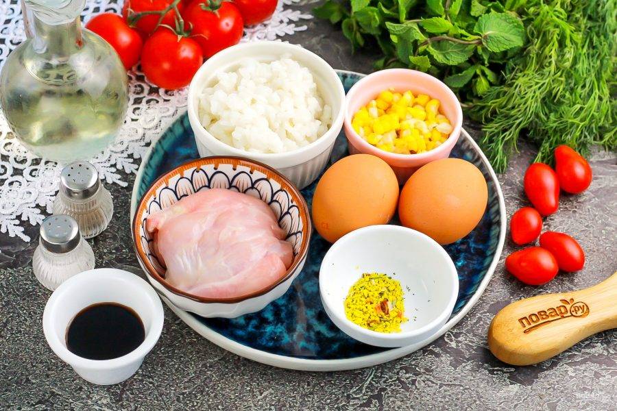 Подготовьте указанные продукты. Рис можно использовать утренний или оставшийся с ужина.
