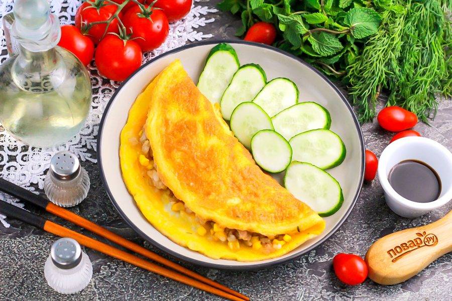 Переместите рис в омлете на тарелку, гарнируйте нарезкой из свежих овощей, зелени и добавьте соусы при подаче.