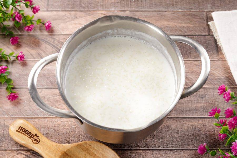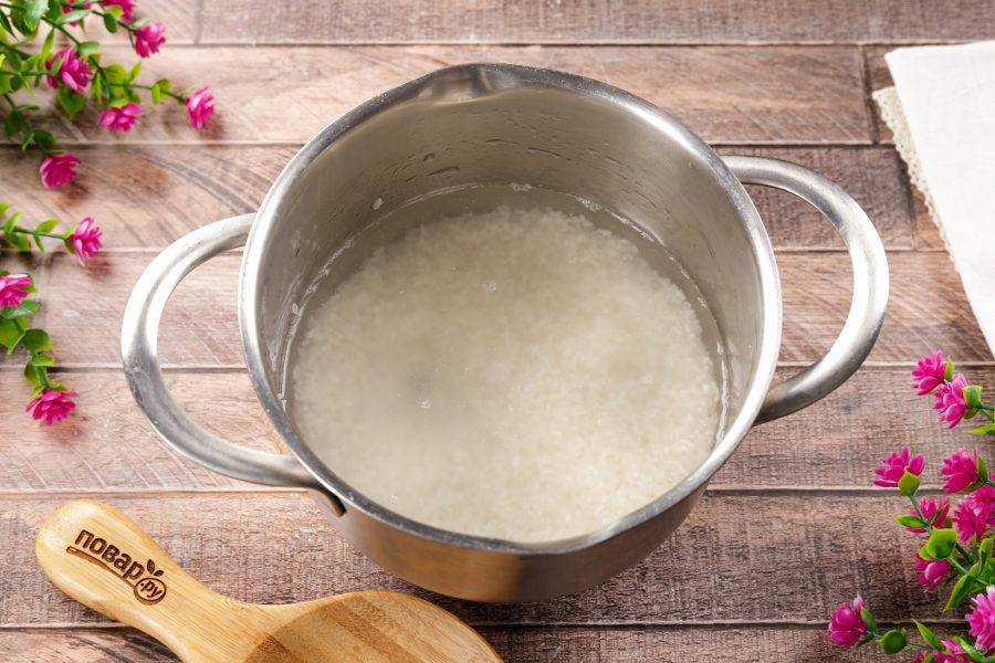 Рис промойте несколько раз в прохладной воде и переложите в кастрюлю.