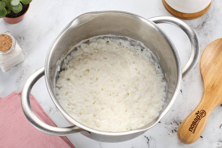 Снова доведите до кипения и убавьте огонь. Каша должна стать гуще, а молоко почти полностью впитаться.