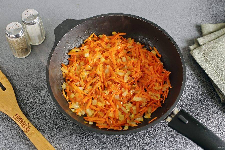 В сковороде разогрейте масло. Выложите нарезанный кубиками лук и тертую морковь.