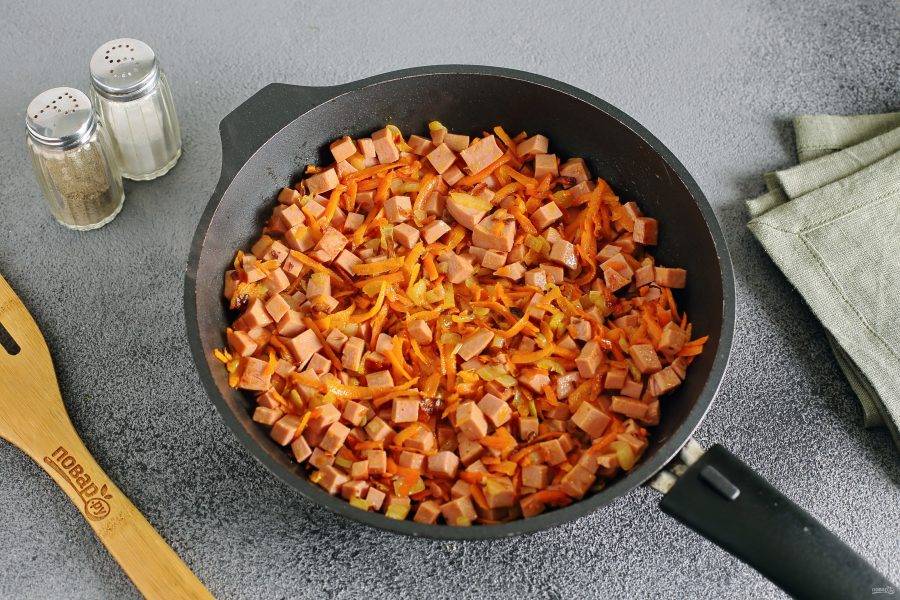 Добавьте нарезанную кубиками колбасу и любые специи по вкусу, жарьте все вместе еще 2-3 минуты.