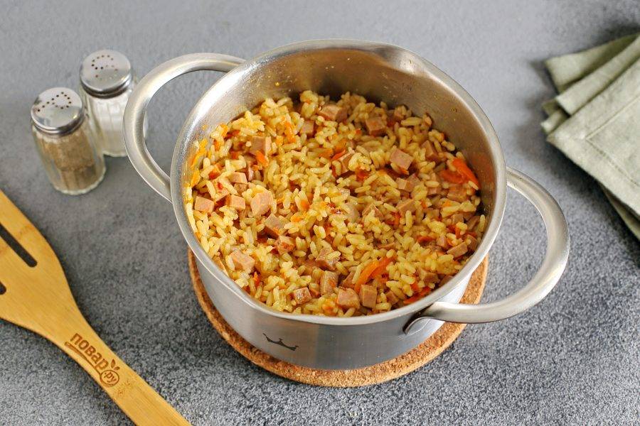 Рисовая каша с колбасой готова. Дайте блюду немного настояться, а затем подавайте к столу.