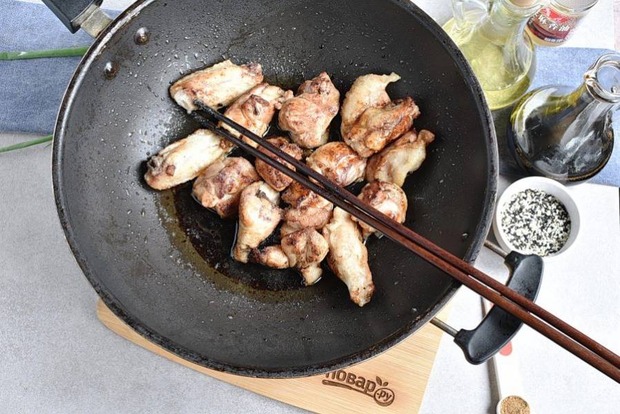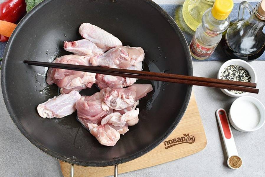 Курицу разрубите на удобные небольшие кусочки вместе с косточками и кожей. Разогрейте растительное масло в воке и обжарьте курицу со всех сторон до румянца.