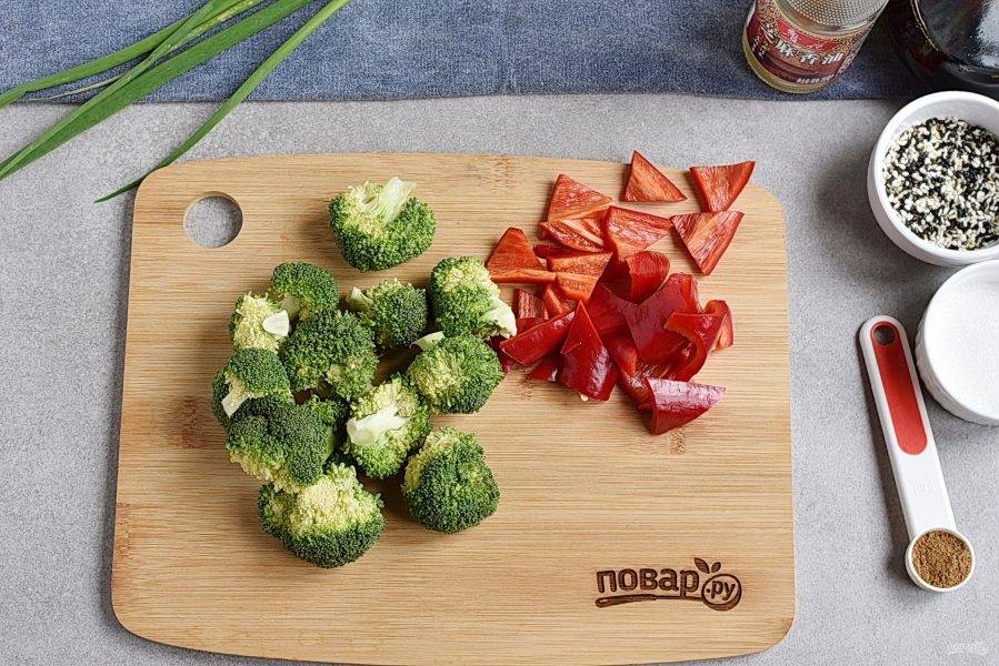 Сладкий перец нарежьте уголками, а брокколи просто разберите на мелкие соцветья.