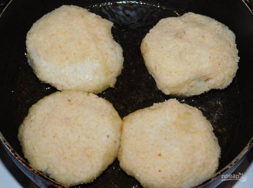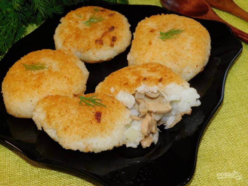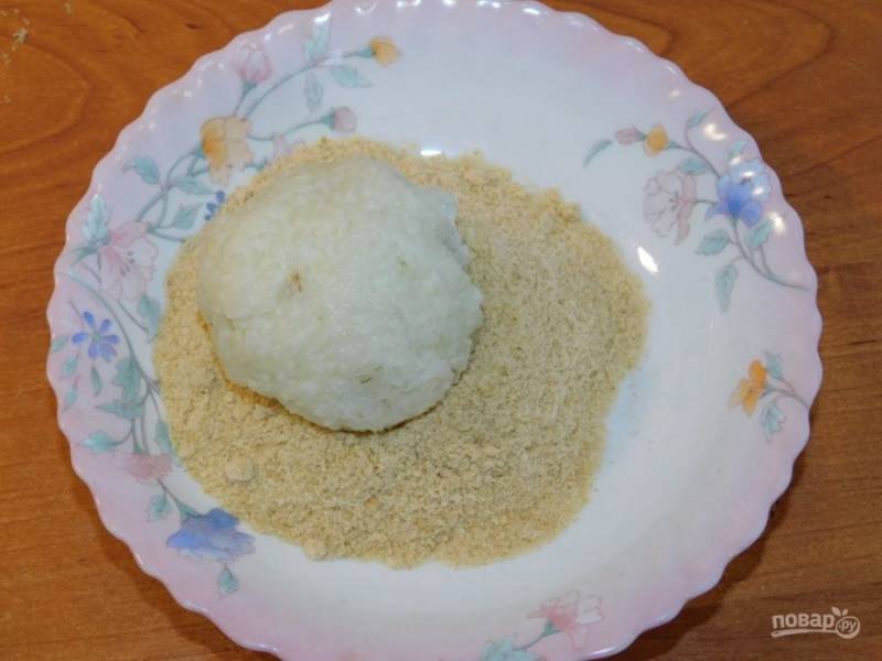 Руки смочите в воде, возьмите немного рисовой массы, скатайте шарик и сделайте в нем углубление. Вложите немного грибной начинки и сформируйте в виде шара. Обваляйте в панировочных сухарях.