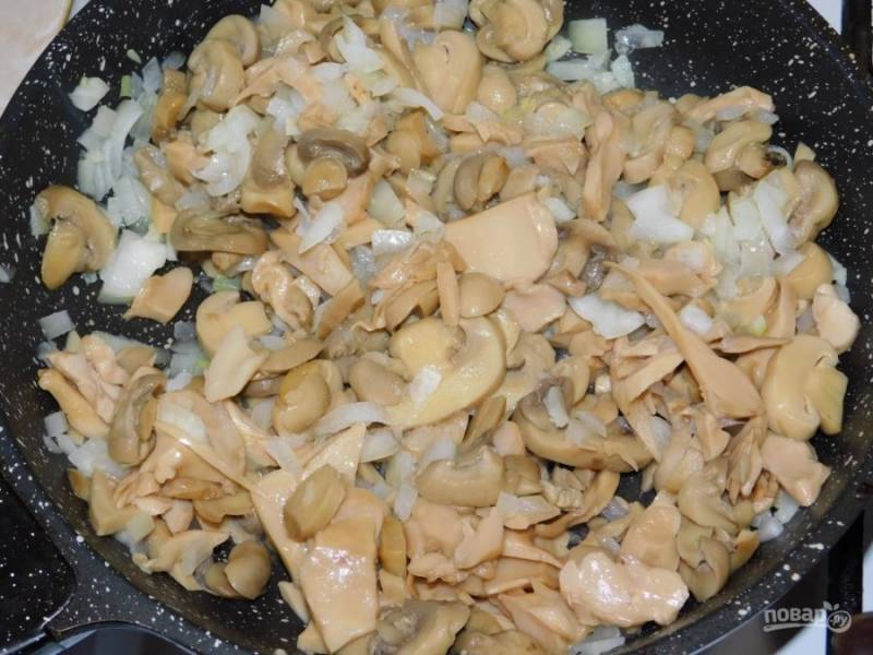 Шампиньоны обжарьте с луком и чесноком. Немного посолите.